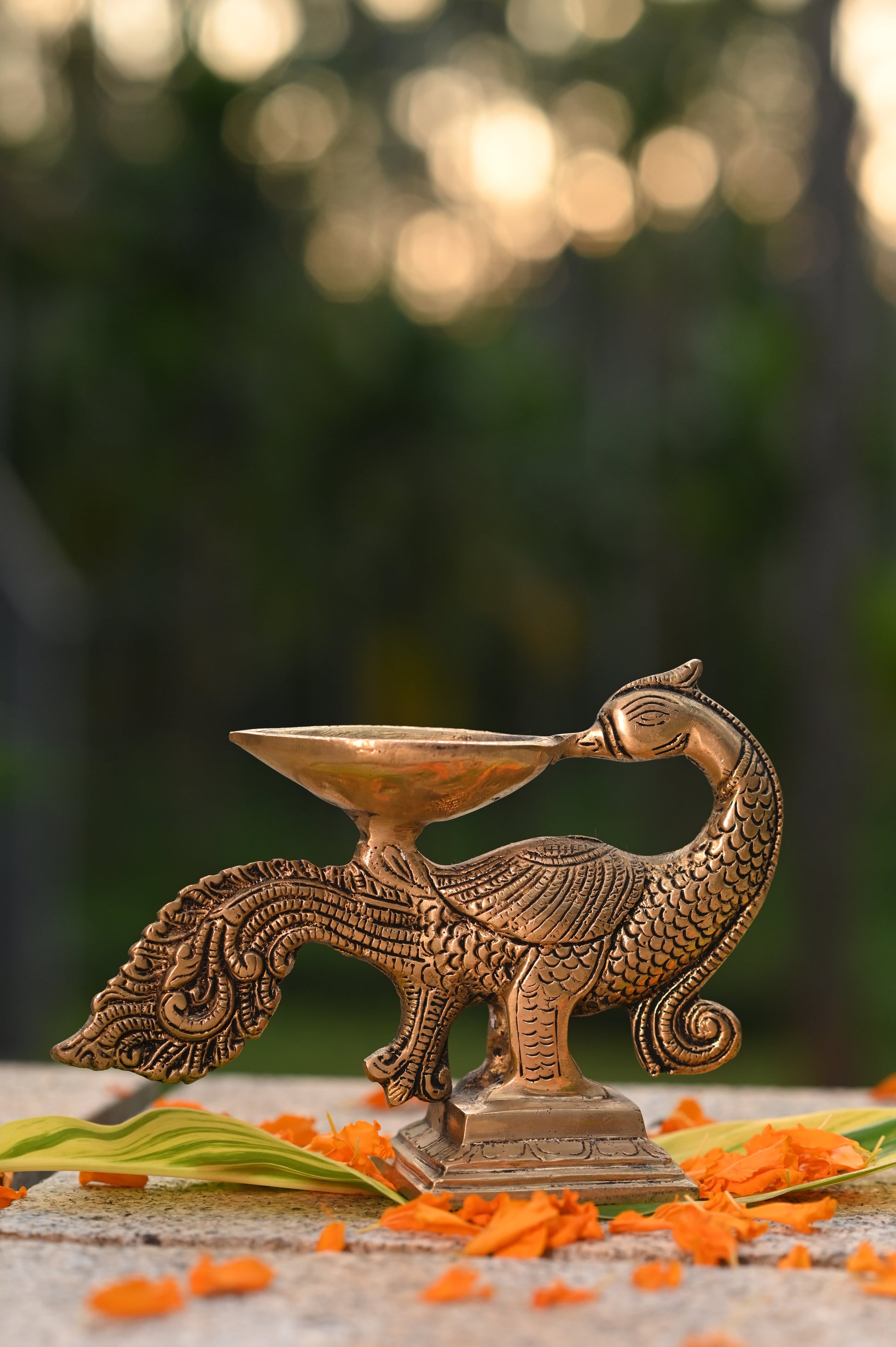 The Peacock Fancy Oil Lamp Brass is an exquisite traditional lamp that beautifully combines the rich cultural heritage of India with intricate craftsmanship. Shaped like a majestic peacock, this oil lamp is designed to add a touch of elegance and divine light to your pooja space, home decor, or festive celebrations. Crafted from high-quality brass, this lamp serves as both a spiritual symbol and an ornamental piece, making it an essential addition to any sacred space.