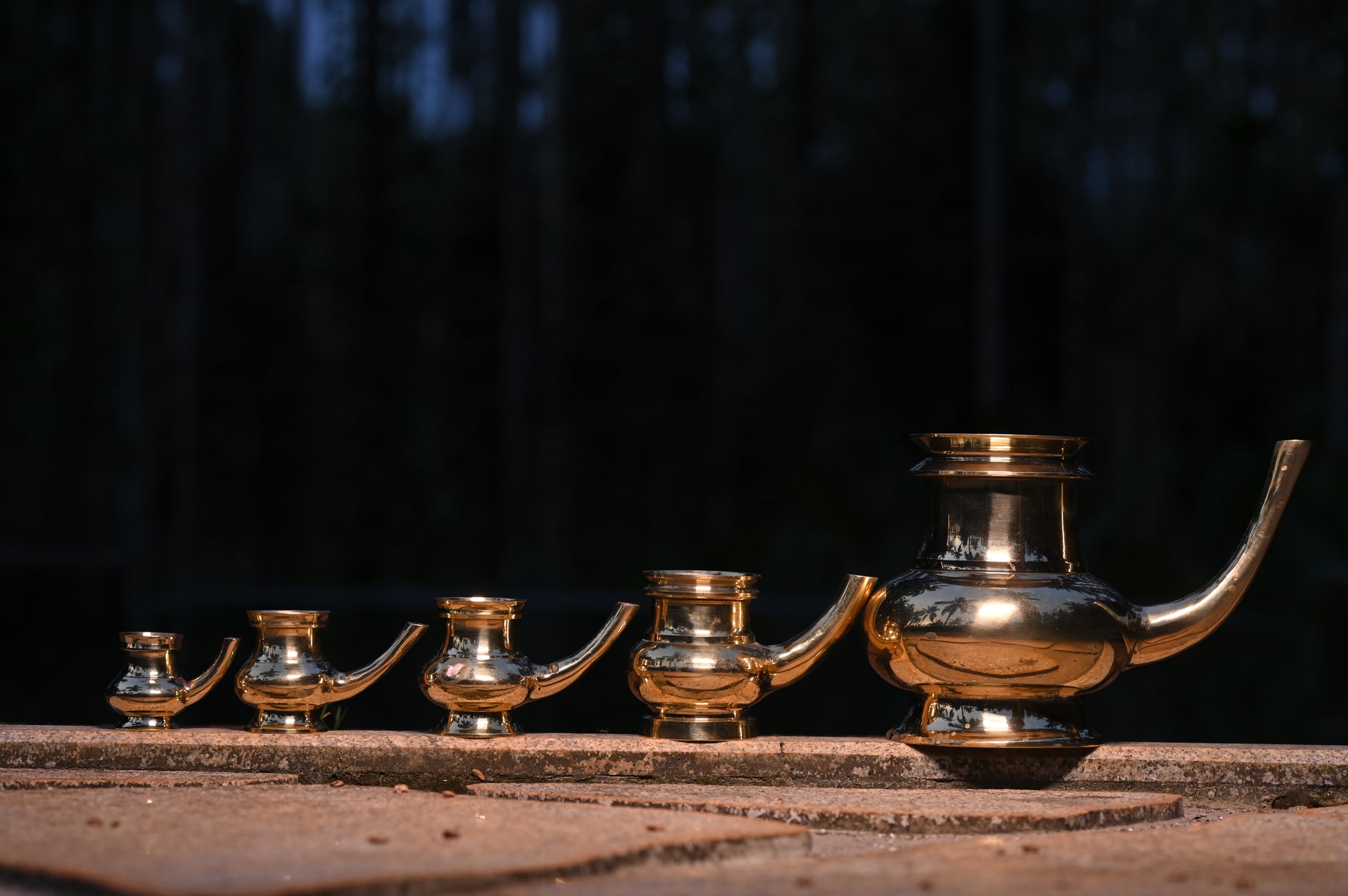 The Kerala Brass Kindi Set is a beautifully crafted traditional water vessel set that brings a touch of Kerala’s cultural heritage into your pooja space. This set, complete with a classic kindi (water pot) and accompanying accessories, is used in Hindu rituals and ceremonies for offering holy water or purifying spaces. The elegant brass construction not only adds a timeless beauty to your decor but also serves an important role in daily prayers and auspicious occasions.