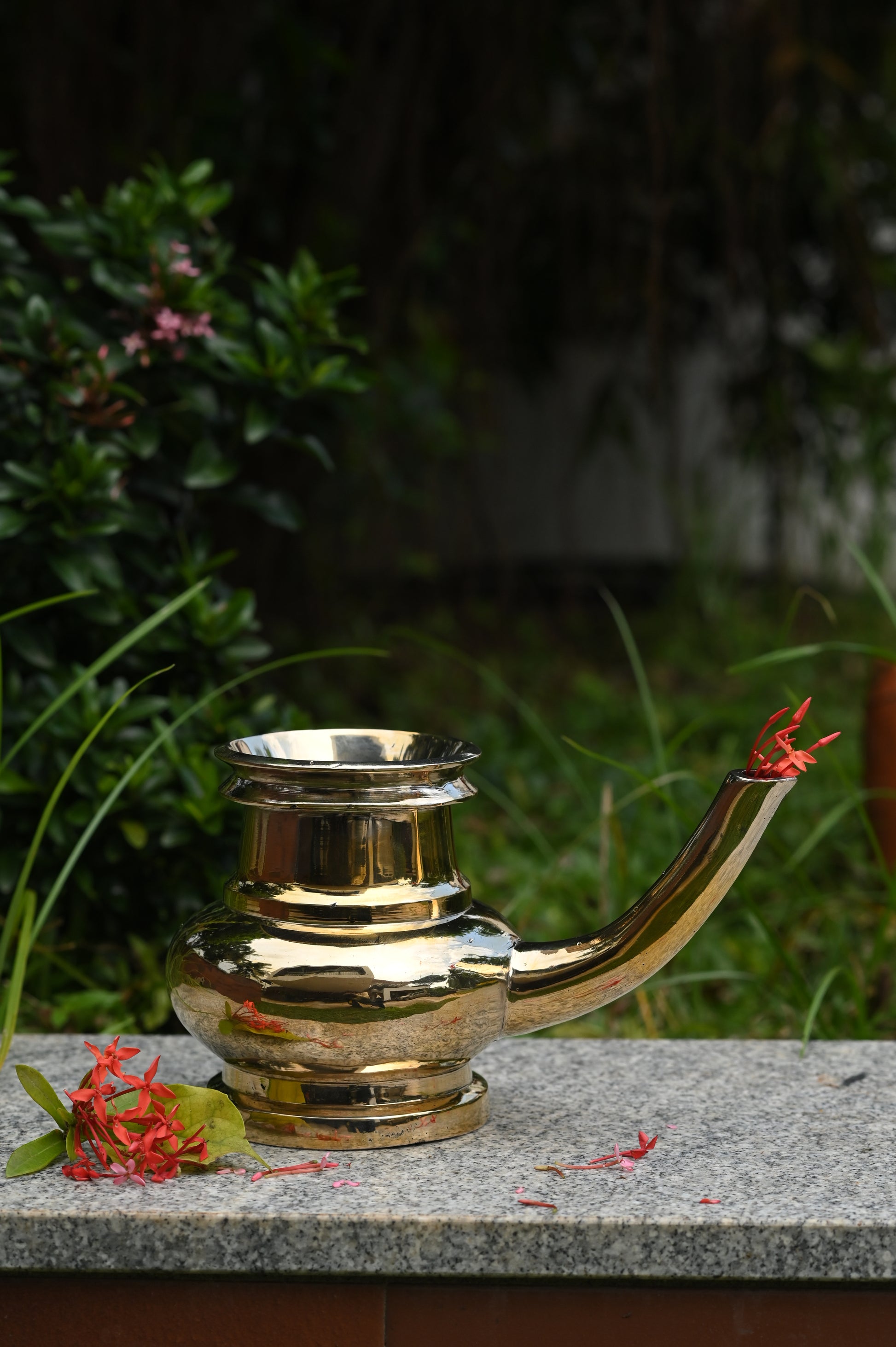 The Kindi is a classic brass water vessel traditionally used in South Indian rituals and daily practices. Known for its unique spouted design, the Kindi serves a vital role in religious ceremonies, particularly during poojas and offerings. Handcrafted from high-quality brass, this vessel is both durable and aesthetically pleasing, making it an essential item for spiritual use and home decor.