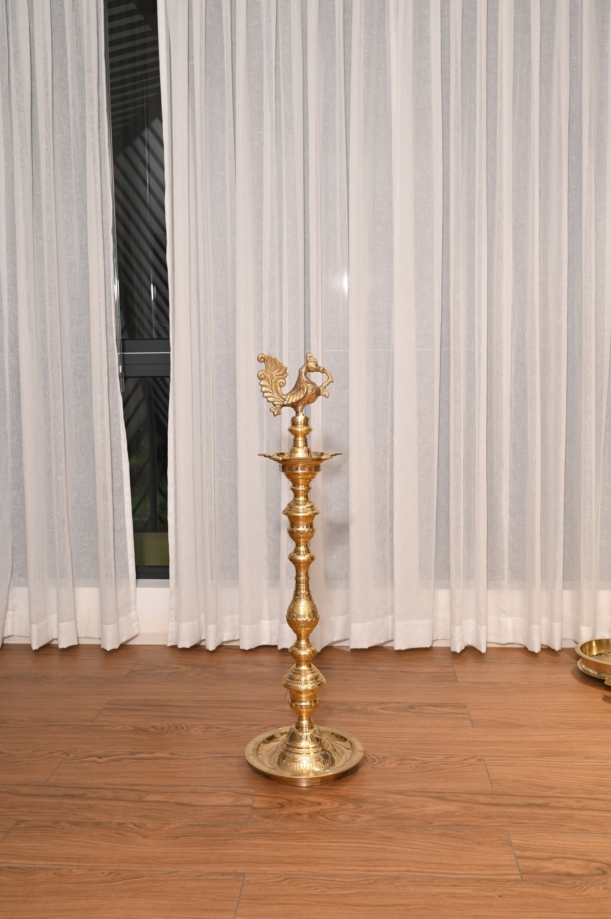 The Peacock Brass Oil Lamp - Medium is a stunningly crafted traditional oil lamp that combines spiritual significance with artistic design. Made from high-quality brass, this medium-sized oil lamp is designed to illuminate your pooja room, altar, or sacred space, filling it with warmth, light, and divine energy. The peacock design, a symbol of beauty, grace, and prosperity, adds a unique touch of elegance and sophistication to your home decor.