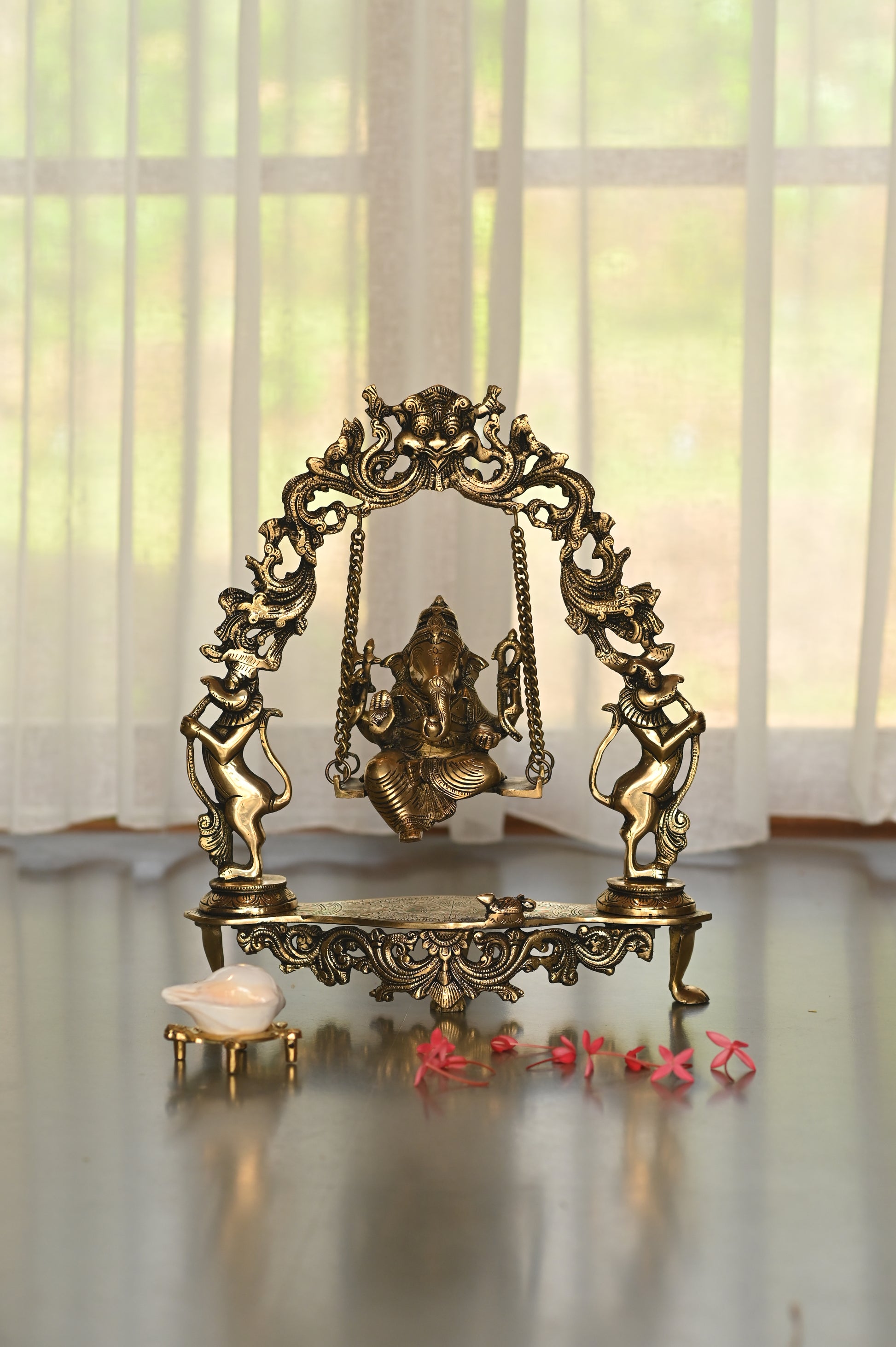 The Jhula Ganesh Brass Idol - Medium is a beautifully crafted representation of Lord Ganesha, the beloved remover of obstacles and the bringer of good fortune, in a dynamic and graceful swing pose. Made from high-quality brass, this idol not only serves as a powerful spiritual symbol but also acts as an exquisite piece of home decor, radiating elegance and positivity. This idol is designed to captivate the hearts of devotees, adding spiritual significance and aesthetic charm to any space.
