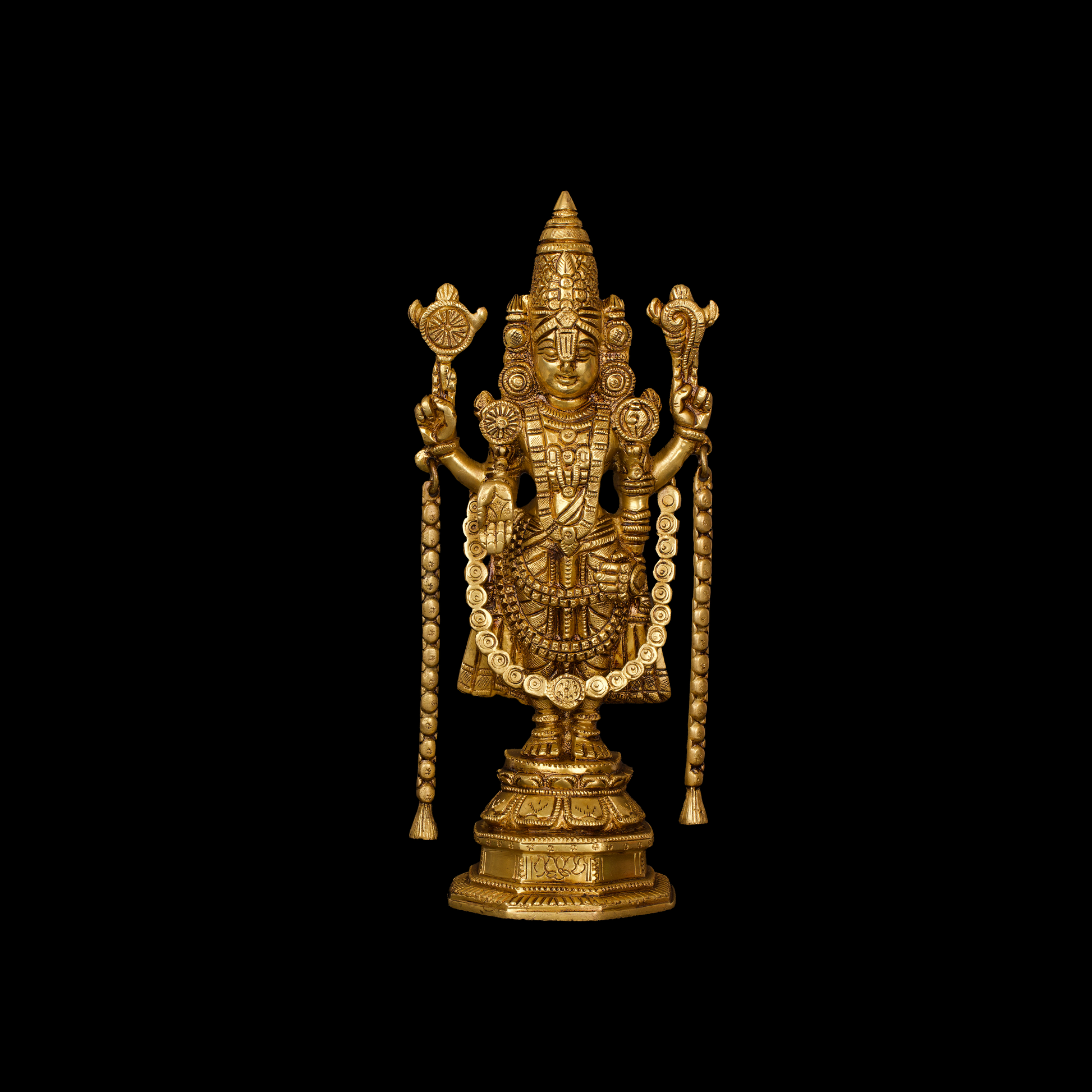 Antique gold finish with intricate carvings that highlight Lord Balaji’s serene expression, sacred ornaments, and the distinctive latkan (hanging garland) design, symbolizing abundance and divine prosperity.