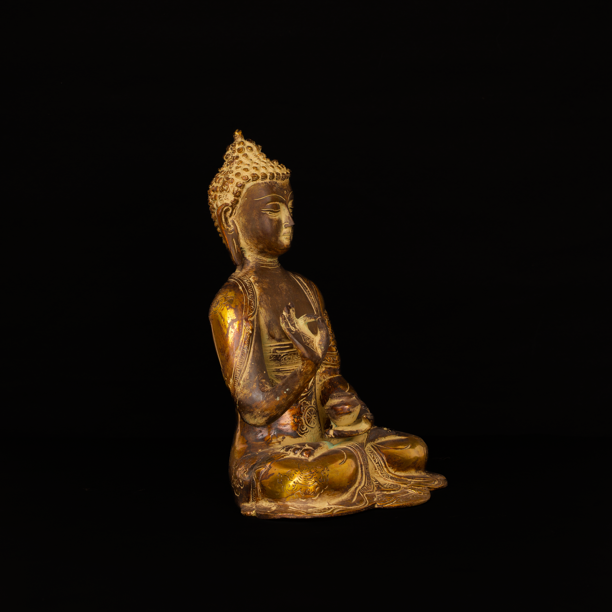 Gold-bronze polish with intricate robe carving and traditional detailing, showcasing meditative posture and tranquil presence.