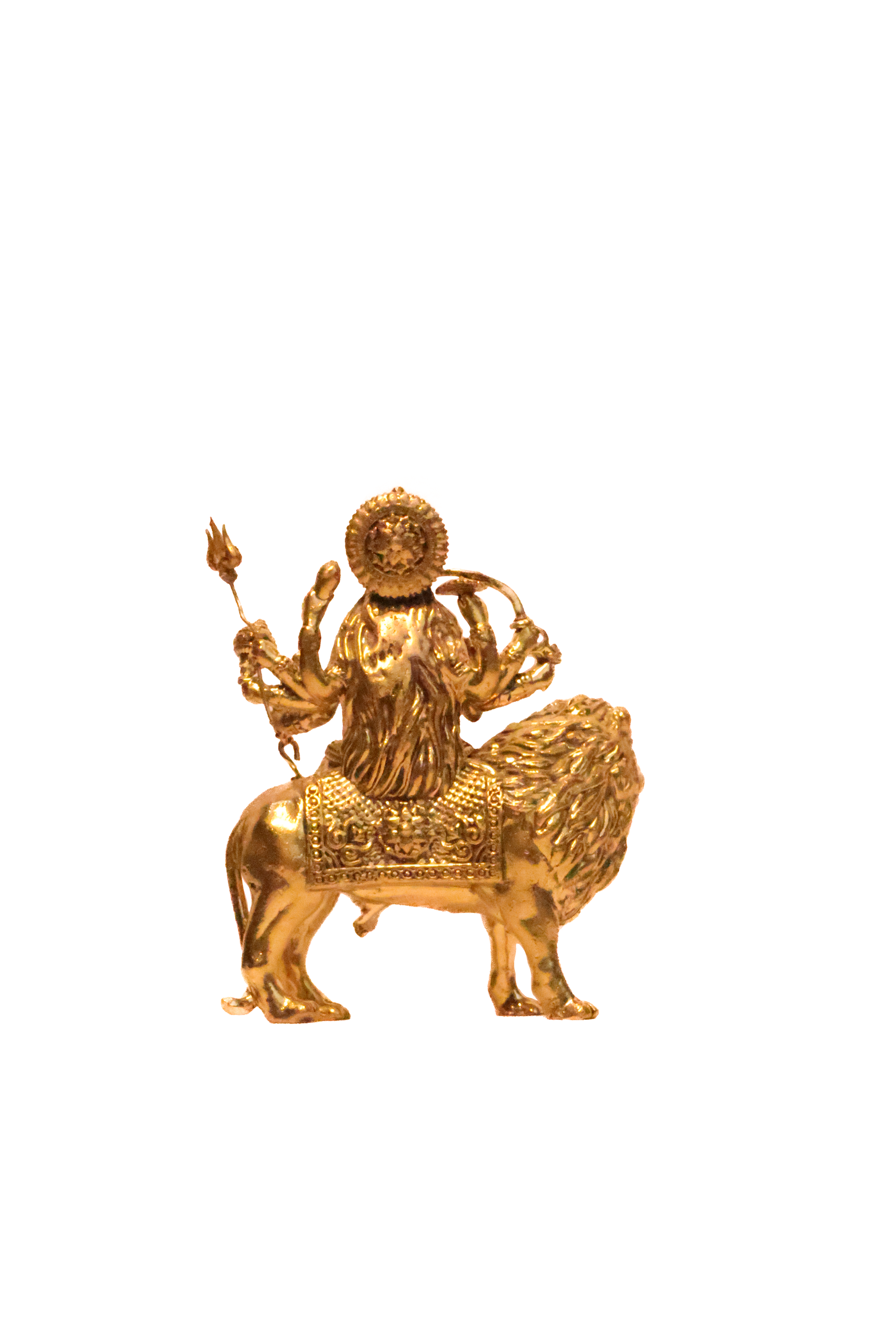 Design: Maa Durga majestically riding her lion (Simha), with multiple arms holding the trishul, chakra, khadga and other divine symbols—embodying shakti and fearlessness