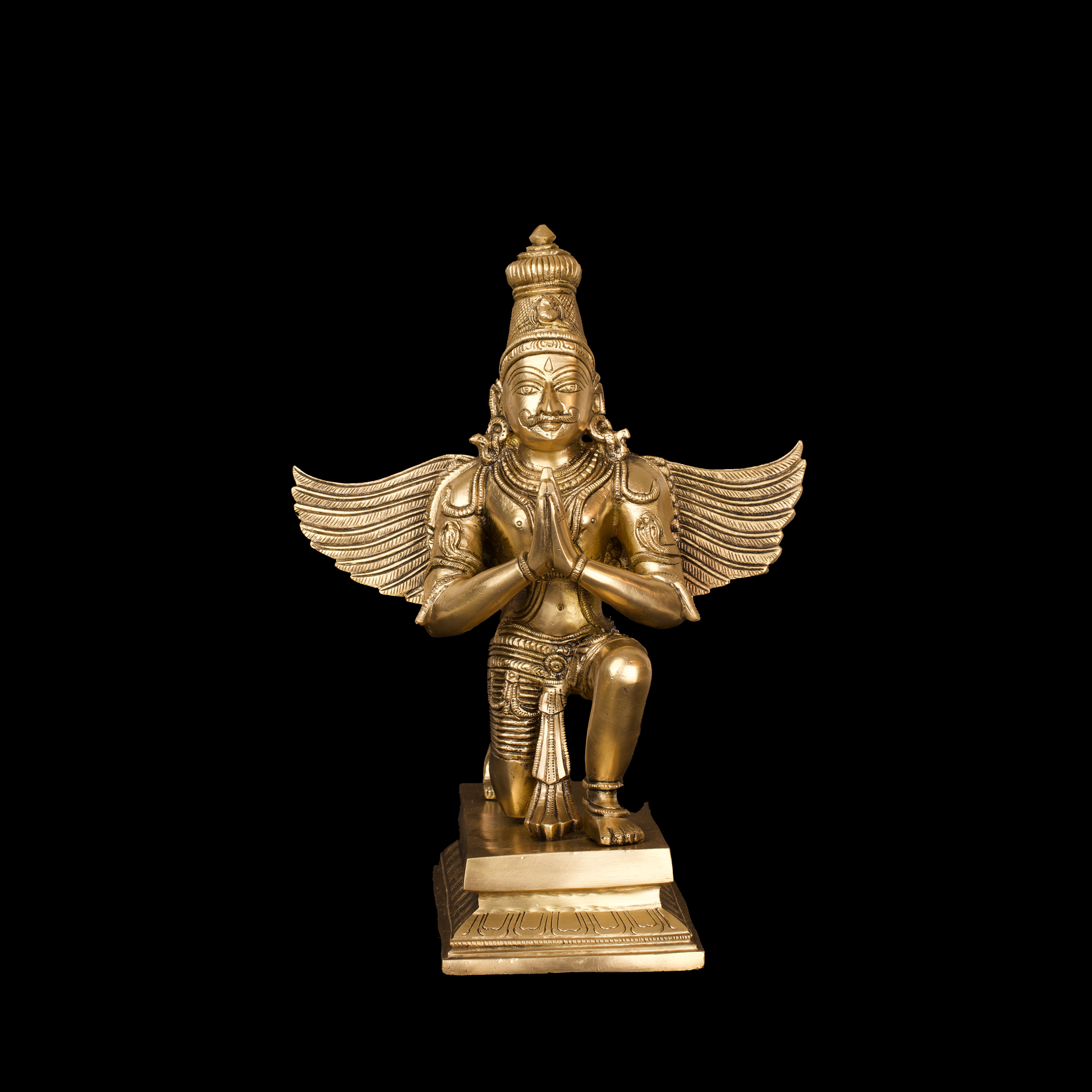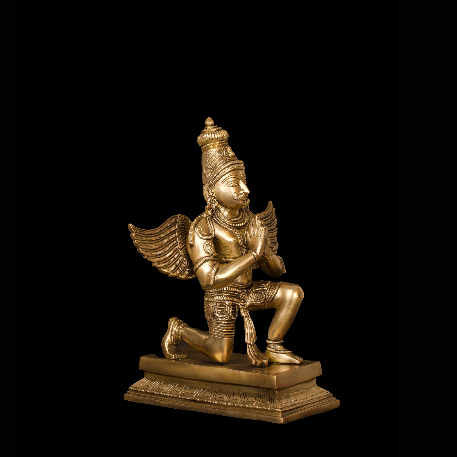 Depicts Garuda, the celestial vehicle (vahana) of Lord Vishnu, shown in a kneeling position with folded hands, radiating devotion, courage, and loyalty.