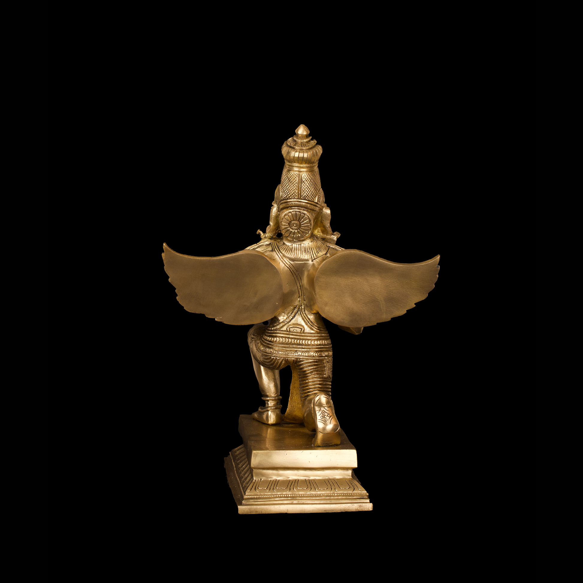 Antique gold polish with fine craftsmanship that accentuates Garuda’s powerful wings, regal ornaments, and reverent kneeling posture — symbolizing humility and unwavering devotion.