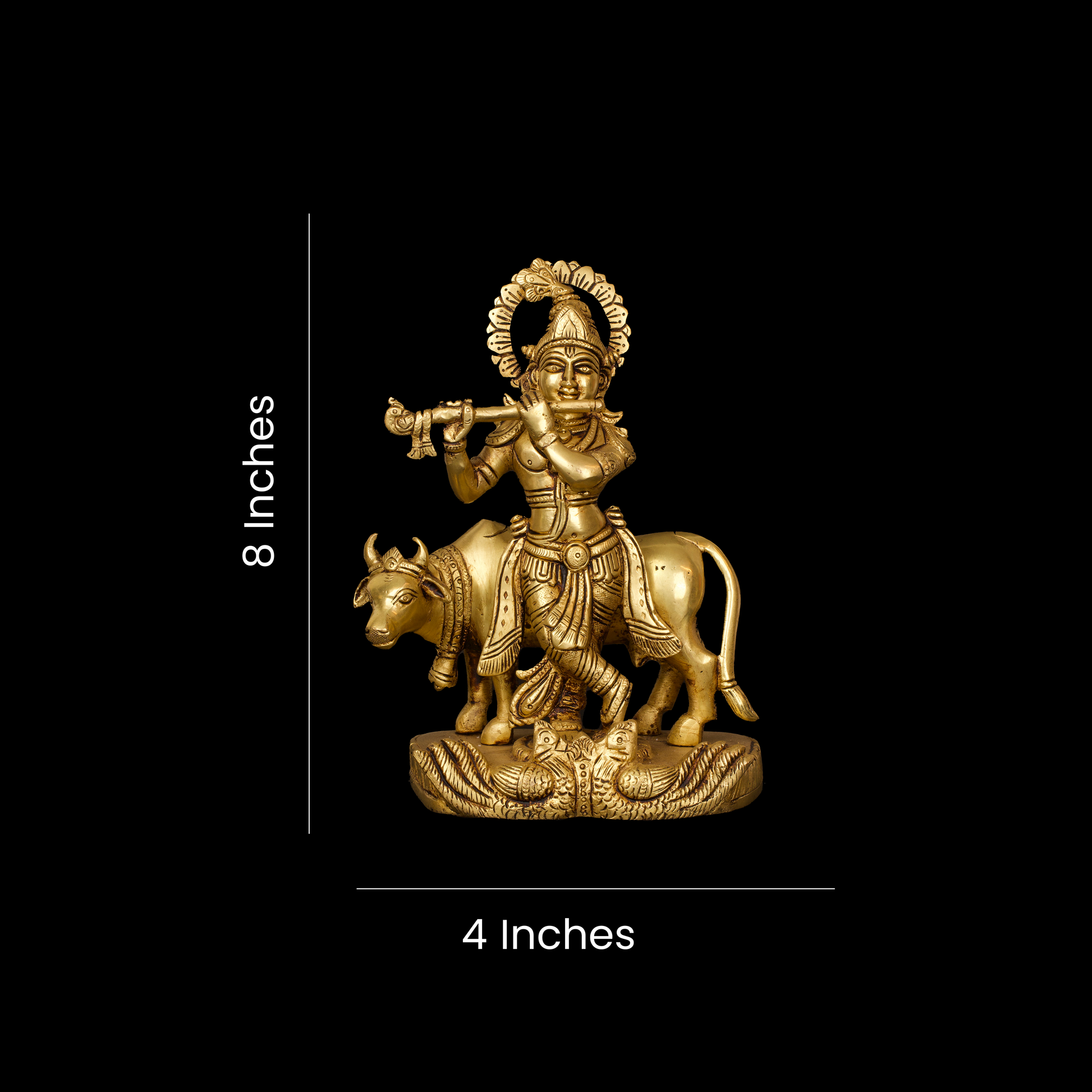 Antique golden-brass polish, highlighting elaborate features of Krishna, his flute, the sacred cow, and ornamental base.