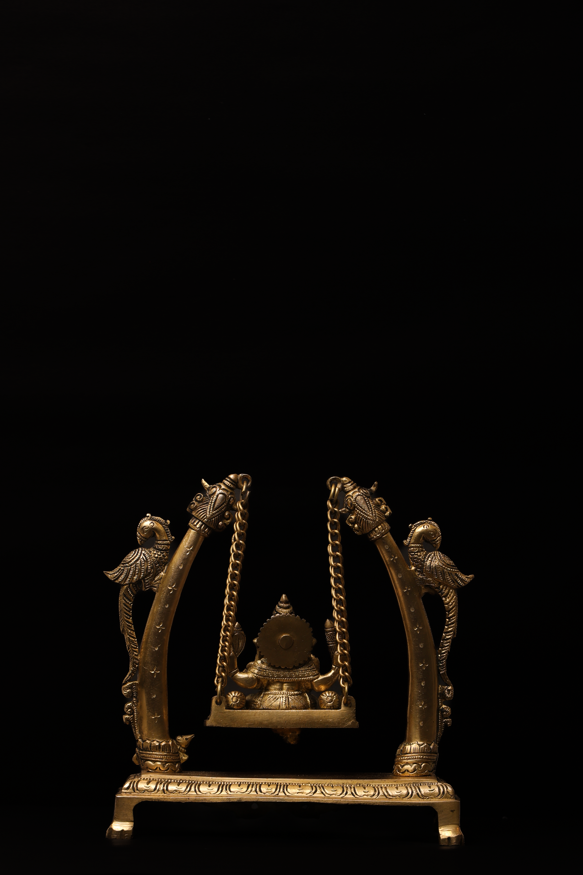 A beautifully crafted statue featuring Lord Ganesha seated gracefully on a swing (jhula), supported by intricately designed tusks adorned with traditional motifs and mythical creatures. The swing represents movement and joy, while Ganesha embodies wisdom, success, and the removal of obstacles. This piece symbolizes balance, growth, and auspicious beginnings.