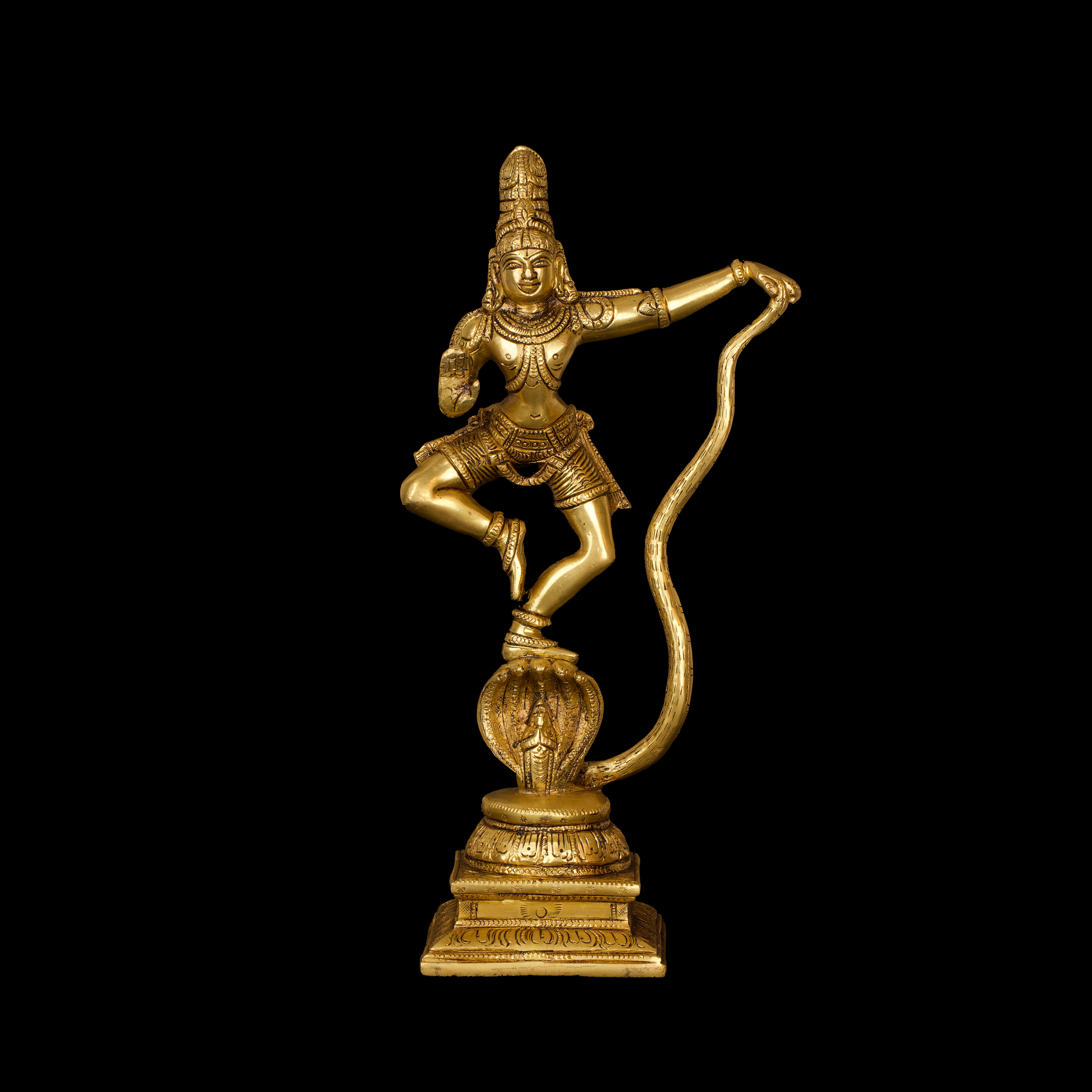Handcrafted from high-quality solid brass by skilled artisans, this idol beautifully captures the divine grace and heroic energy of Lord Krishna in the legendary Kalinga Mardana pose. Each detail reflects devotion and masterful craftsmanship rooted in traditional South Indian artistry.