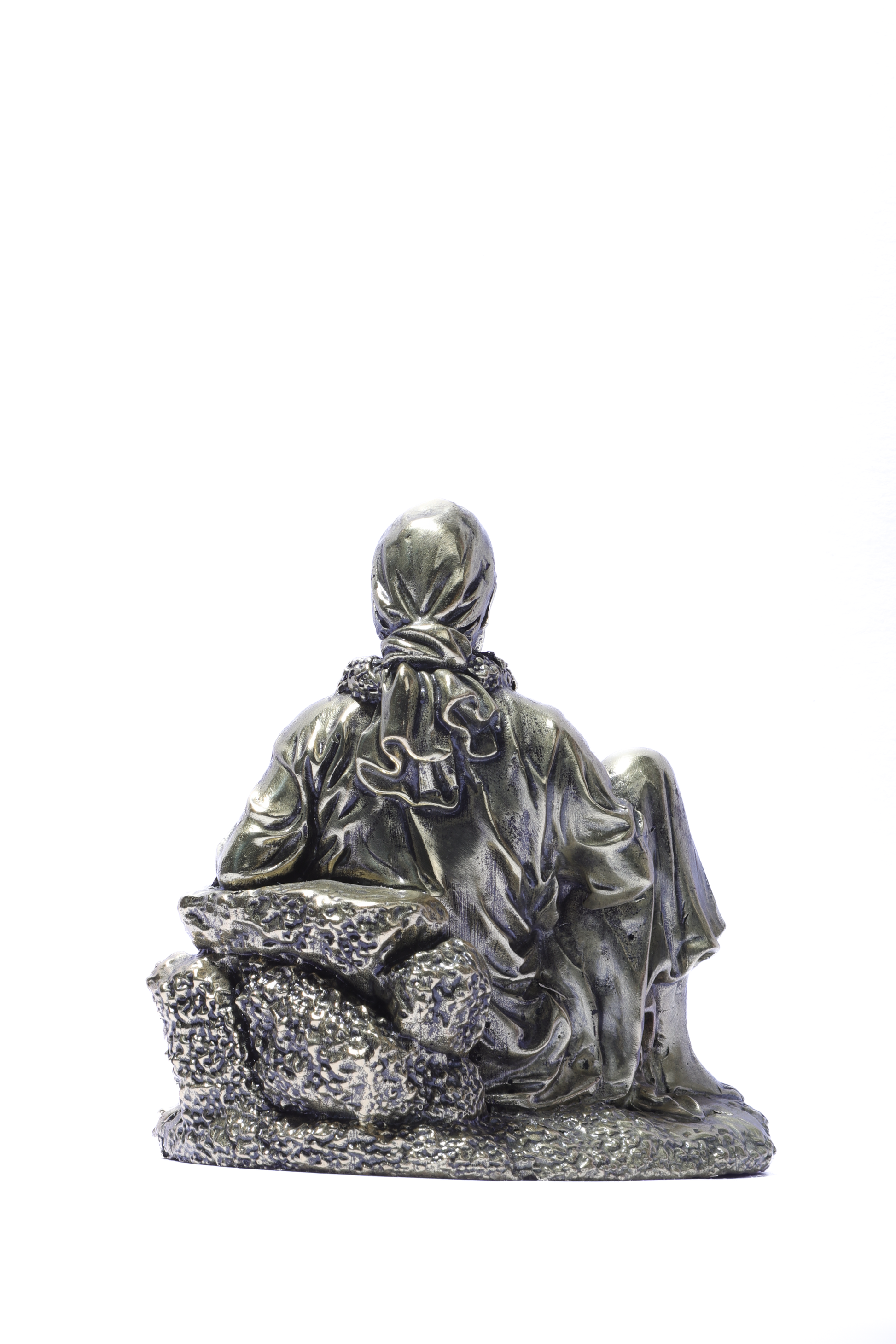 Finish: Antique silver patina with deep etching for lifelike folds and garland details