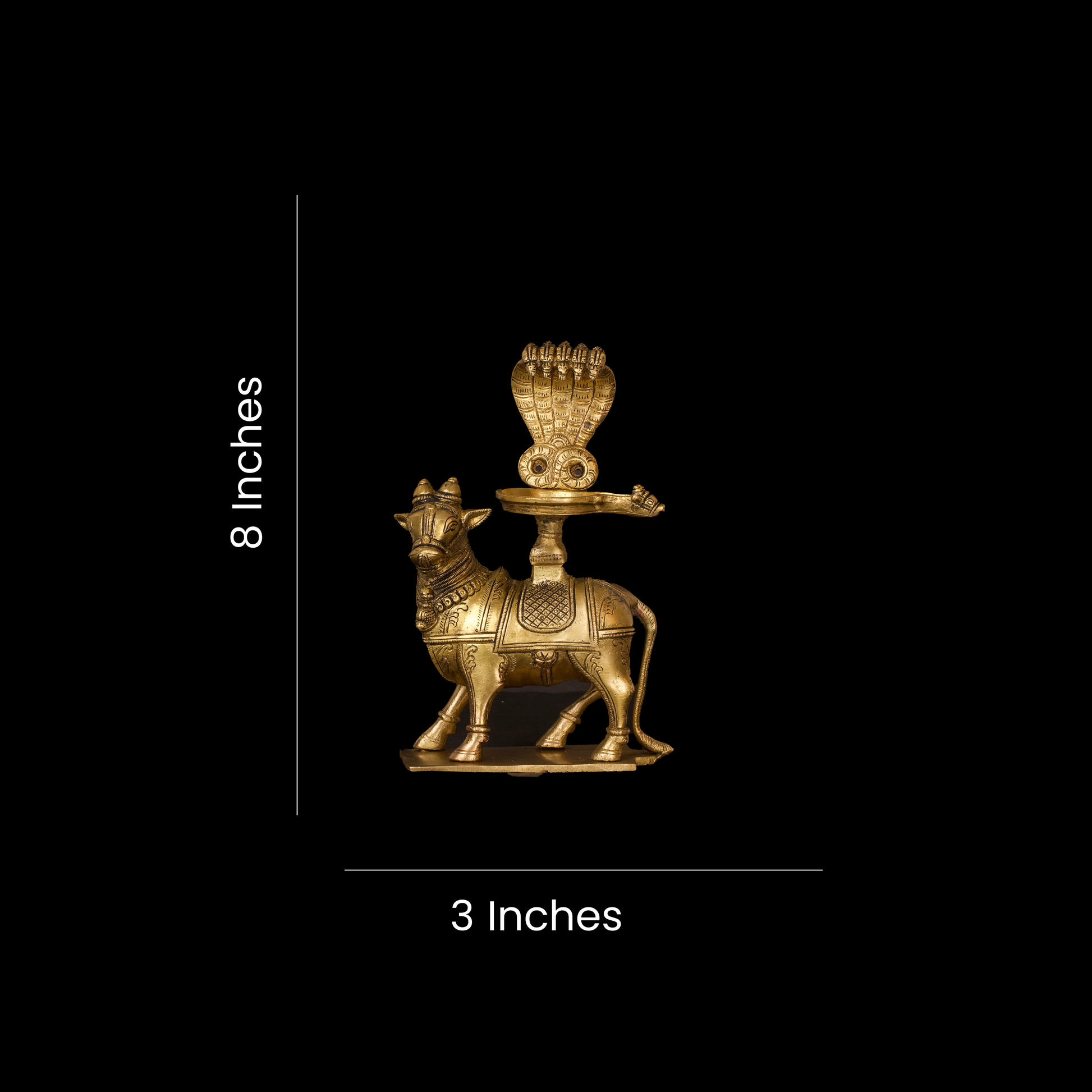 Antique golden-brass polish with detailed etching, highlighting Nandi’s form and the multi-headed serpent (Shesha) above, symbolizing divine protection and strength.