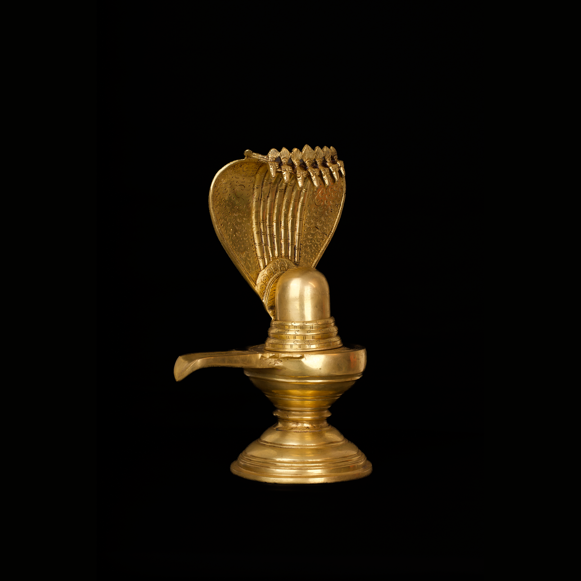 Antique gold polish with detailed craftsmanship, highlighting the Naga (serpent) hood and smooth contours of the Linga, symbolizing creation, protection, and transformation.